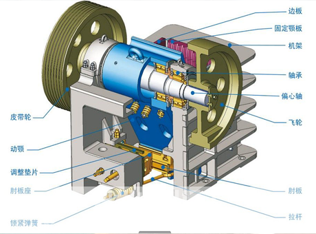 電動(dòng)機(jī)驅(qū)動(dòng)皮帶和皮帶輪,通過(guò)偏心軸使動(dòng)顎上下運(yùn)動(dòng),當(dāng)動(dòng)顎上升時(shí)肘板與動(dòng)顎間夾角變大,從而推動(dòng)動(dòng)顎板向固定顎板接近,與此同時(shí)物料被壓碎或劈碎,達(dá)到破碎的目的;當(dāng)動(dòng)顎下行時(shí),肘板與動(dòng)顎間夾角變小,動(dòng)顎板在拉桿、彈簧的作用下,離開(kāi)固定顎板,此時(shí)已破碎物料從破碎腔下口排出。隨著電動(dòng)機(jī)連續(xù)轉(zhuǎn)動(dòng)而破碎機(jī)動(dòng)顎作周期性地壓碎和排泄物料,實(shí)現(xiàn)批量生產(chǎn)。